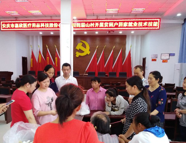 為了讓更多貧困人口能夠就近就業(yè),實現(xiàn)穩(wěn)定增收,促進企業(yè)對貧困村的幫扶,2019年6月18日下午,安慶市嘉欣醫(yī)療用品科技股份有限公司開展了 百企幫百村"精準扶貧行動,生產(chǎn)部經(jīng)理陳迎貴帶領(lǐng)車間技能能手去眉山村實施技能扶貧,對群眾進行一對一,手把手,面對面的培訓。嘉欣醫(yī)療把就業(yè)培訓課堂搬到了群眾家門口。讓這些貧困人員掌握一技之長,從而來改變他們 等要靠"的思想!董事長汪秀春說:我們的精準扶貧就業(yè)以家庭為單位,實現(xiàn)一人就業(yè)全家脫貧。充分調(diào)動貧困人員的勞動積極性,貧困戶可以到村里報名,我們會根據(jù)他的實際情況,為他尋找合適的工作。實現(xiàn)企業(yè)、村集體、貧困戶互助多贏!